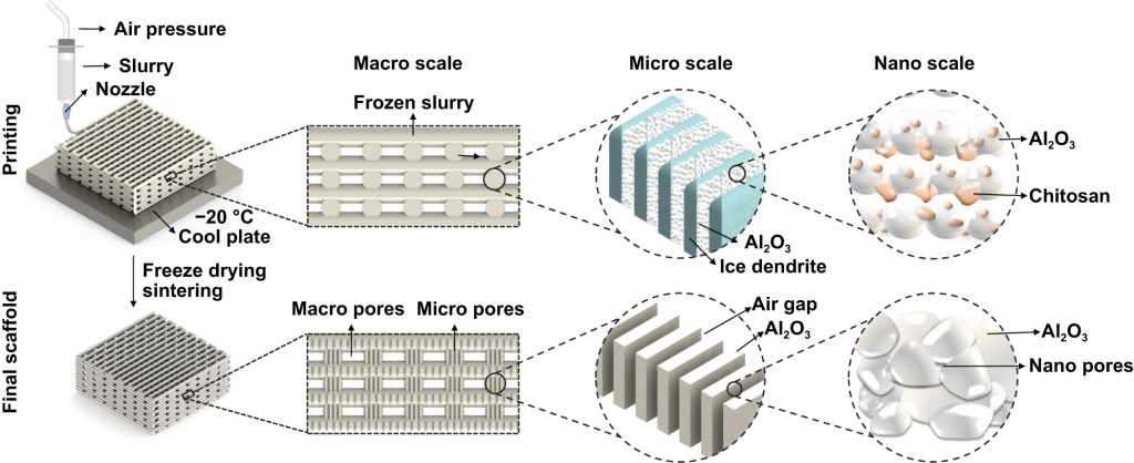 Fabricating damage tolerant porous ceramics with efficient energy absorption and impact-resistant capability has been a challenge because of the brittle nature of ceramic materials. In nature, mineralized tissues or organisms such as cuttlebones and diatoms have evolved with hierarchical porous structures to overcome this difficulty. A bioinspired design of ceramic lattice structure with pores at multiple length scales, ranging from few nanometers to hundreds of micrometers, is proposed in the present work. These ceramic lattices with hierarchical porous structures were successfully fabricated via 3D cryogenic printing. Under quasi-static compressions, the printed ceramic lattices showed unprecedented long plateau strain (∼60%) and a specific energy absorption of ∼10 kJ·kg‒1 with a porosity of ∼90%. The resulting energy absorption capability was comparable with most composites and metals, thus overcoming the brittle nature of traditional porous ceramics. This was attributed to the delayed destruction of the lattice structure, as well as the gradual collapse of pores at multiple length scales. Similar trends have also been observed under split Hopkinson pressure bar (SHPB) tests, indicating excellent energy absorption under high strain-rate impacts. The proposed 3D printing technique that produces hierarchical pores was also demonstrated to apply to other functional materials, such as silicon carbide, barium titanate, hydroxyapatite, and even titanium alloy, thus opening up new possibilities for fabricating bioinspired hierarchical porous structures.