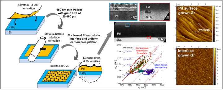 Wrinkles invariably form during graphene growth and post-growth transfer, limiting graphene films’ large-scale uniformity for electronic applications. We report a transfer-free synthesis route for highly-uniform bilayer graphene directly on dielectric substrates—SiO2, sapphire, and MgO—by interfacial carbon precipitation. Ultrathin Pd leaves having a thickness of 150 nm and grain size up to 100 µm are laminated onto the target dielectric substrate, followed by annealing and press rolling to form a uniform Pd-substrate interface. Rapid heating in a hydrocarbon atmosphere causes carbon diffusion through the Pd layer; upon cooling, precipitation of carbon results in graphene growth at the Pd-substrate interface. The interface-grown graphene remains on the substrate after removing the Pd layer by wet etching. It exhibits sub-nm surface roughness without wrinkles or folds. Over 94% of the interface-grown area is dominated by bilayer graphene with low twist angles. In addition, the interface-grown graphene is nearly strain-free. From Raman characterization, an average long-range scattering mobility of ∼1000 cm2 V-1 s-1 was estimated for as-grown bilayer graphene on sapphire (0001) at room temperature. This technique shows promise to achieve device scale, ultra-uniform graphene fabrication directly on dielectric substrates, with the potential to accelerate graphene applications in electronics, photonics, and sensing.