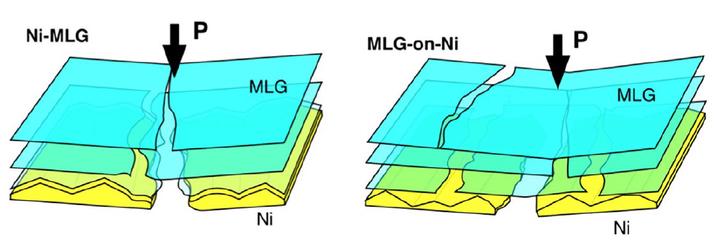 Owing to the superior strength and atomic thickness of graphene, it can in theory reinforce metals beyond the usual rule of mixtures bounds by constraining dislocations motion and strain localization at the grain boundaries. This unusual enhancement relies on the graphene’s ability to conform to and wrap metal grains. This study experimentally probes the limits of this behavior and investigates the role of interface in designing superior graphene composites. Free‐standing nickel–multilayer graphene (Ni–MLG) nanomembranes are fabricated by in situ chemical vapor deposition. Using nanoindentation, elastic modulus (285.16 GPa), maximum stress (2.35 GPa), and toughness (1407.26 Jm−2) are measured, and these values exceed the rule of mixtures bounds. The multi‐frequency atomic force microscopy (AFM) is used to spatially map the elastic properties and topography of the MLG on Ni grain boundaries. This emerging characterization reveals that effective reinforcement is achieved when graphene conforms and bridges the grain texture. Nanoindentation and AFM confirm that these mechanisms are ineffective in non‐conformally attached Ni–MLG composites, which exhibit significantly weaker mechanical behavior. These results guide the design of effective graphene composites by highlighting the importance of nanoscale roughness and interfaces, and clearly demonstrate the superiority of composite processing routes based on in situ graphene synthesis.