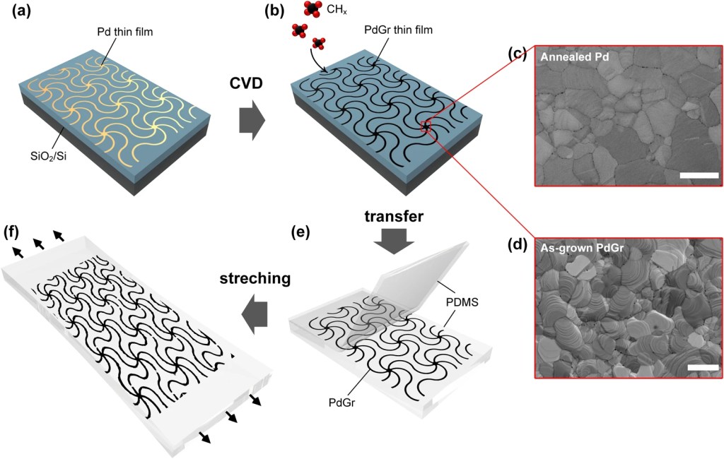 Conductive patterned metal films bonded to compliant elastomeric substrates form meshes which enable flexible electronic interconnects for various applications. However, while bottom-up deposition of thin films by sputtering or growth is well-developed for rigid electronics, maintaining good electrical conductivity in sub-micron thin metal films upon large deformations or cyclic loading remains a significant challenge. Here, we propose a strategy to improve the electromechanical performance of nanometer-thin palladium films by in-situ synthesis of a conformal graphene coating using chemical vapor deposition (CVD). The uniform graphene coverage improves the thin film’s damage tolerance, electro-mechanical fatigue, and fracture toughness owing to the high stiffness of graphene and the conformal CVD-grown graphene-metal interface. Graphene-coated Pd thin film interconnects exhibit stable increase in electrical resistance even when strained beyond 60% and longer fatigue life up to a strain range of 20%. The effect of graphene is more significant for thinner films of < 300 nm, particularly at high strains. The experimental observations are well described by the thin film electro-fragmentation model and the Coffin-Manson relationship. These findings demonstrate the potential of CVD-grown graphene nanocomposite materials in improving the damage tolerance and electromechanical robustness of flexible electronics. The proposed approach offers opportunities for the development of reliable and high-performance ultra-conformable flexible electronic devices.